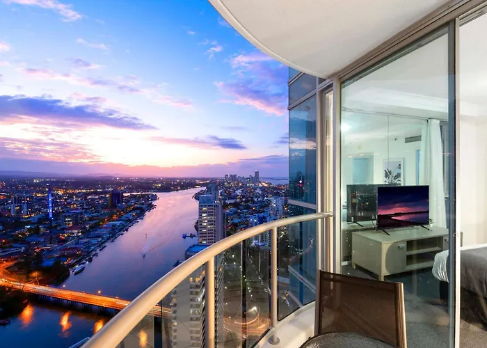 El apartamento High Floor - Chevron Renaissance - Self Contained & Privately Managed - Wow Stay Gold Coast se encuentra a 300 metros del mirador El Infinito y ofrece a sus huéspedes un jacuzzi, una sauna y una piscina cubierta. Este apartamento está situado en el distrito Surfers' Paradise, a 2 km del Centro de Arte The Arts Centre Gold Coast.